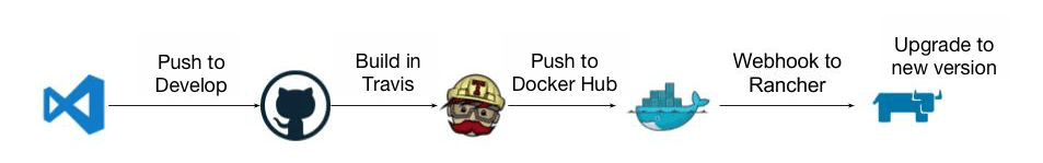 To do this we used our existing Travis CI build setup to build Docker images whenever a commit was merged to Develop and then upload them to Docker Hub. Docker Hub would then fire a web-hook to Rancher requesting it to upgrade the running service and pull the latest staging image from Docker Hub.